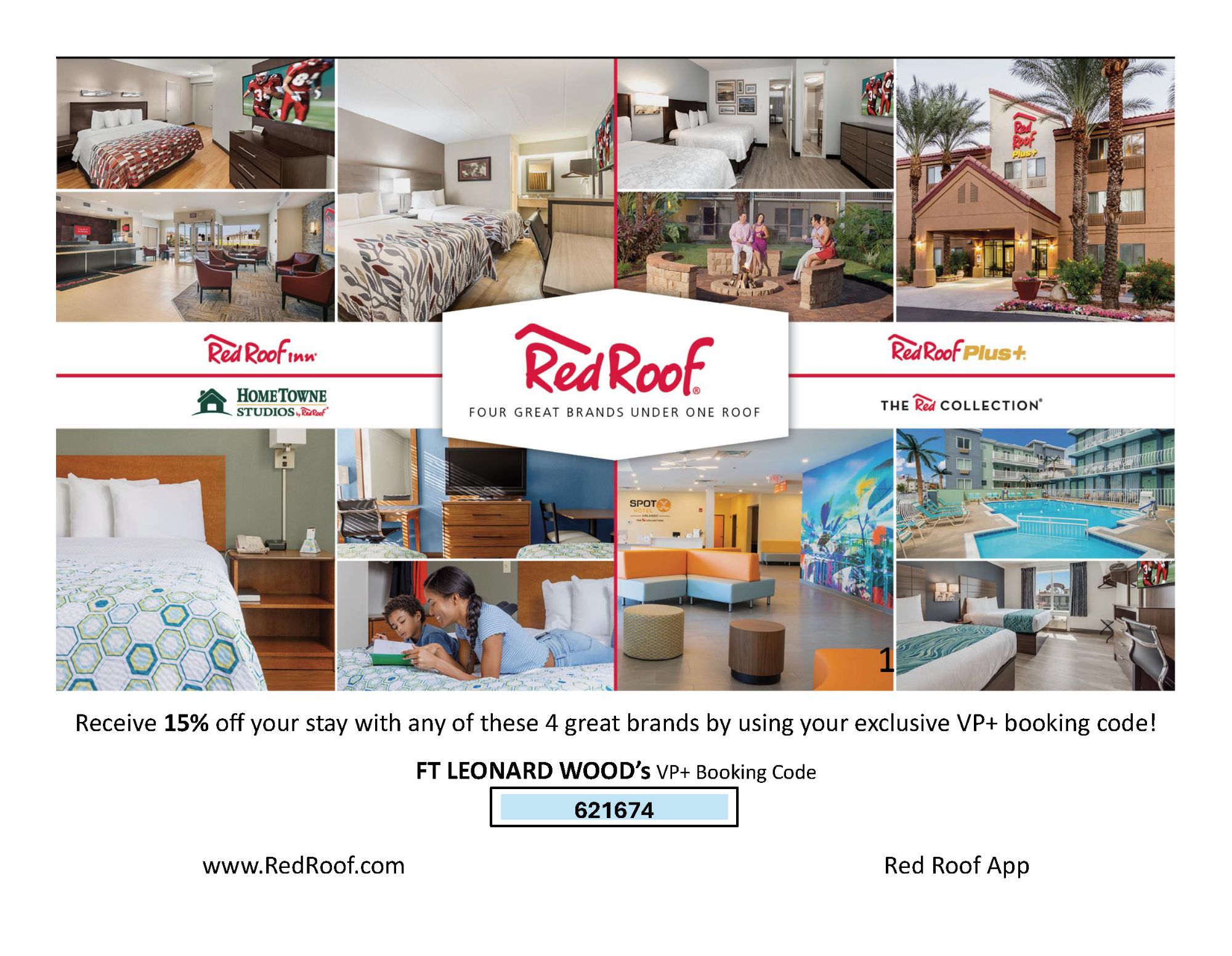 Receive 15% off your stay with any of these 4 great brands under Red Roof by using Fort Leonard Wood's VP+ Booking Code 621674.